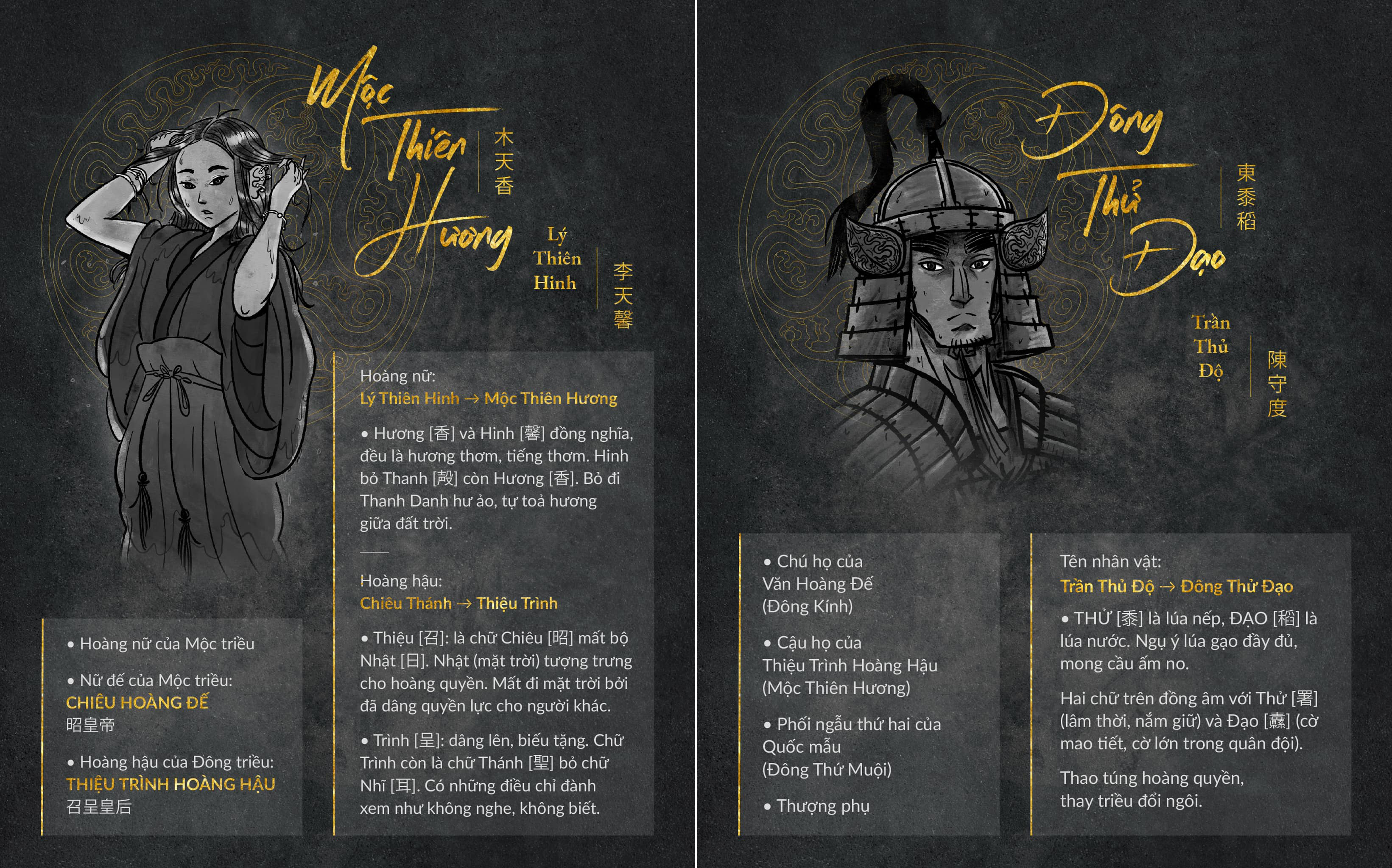 Vậy là mỗi khi nhân vật Mộc Thiên Hương xuất hiện, đầu óc bạn đọc sẽ phải mất thêm công đoạn dịch cái tên ấy trở về Lý Thiên Hinh, và nếu Đông Thử Đạo chường mặt ra, ta sẽ phải tự nhắc mình rằng đây là Trần Thủ Độ, người có hẳn một bộ phim mang tên ông ta được chiếu dài kỳ trên VTV tầm chục năm về trước.